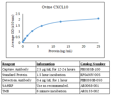 The Ovine CXCL10 (IP-10) ELISA contains capture antibody, standard, and detection antibody for development of a Ovine CXCL10 ELISA. The antibodies have been determined to function in an ELISA with the standard provided. Optimal buffers, concentrations, incubation times, incubation temperatures, and methods for the ELISA have not been determined. This allows for complete flexibility to provide optimal dynamic range and sensitivity based on your sample type. Alternate names include CXCL10, C7, IFI10, INP10, IP-10, SCYB10, crg-2, gIP-10, mob-1, C-X-C motif chemokine ligand 10, C-X-C motif chemokine 10. The quantities of components provided are not matched. Components may also be purchased separately. For research use only. Made in the USA