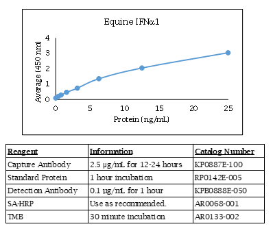 The Equine IFN alpha 1 polyclonal antibody is labeled and has been qualified for use in ELISA. It is the detection antibody in the Kingfisher Biotech Equine IFN alpha 1 ELISA. The Equine IFN alpha 1 antibody was produced in rabbits and is antigen-affinity purified. The reactivity by species is: (Bovine IFN-alphaA - Weak) (Canine IFN-alpha - Weak) (Chicken IFN-alpha - None) (Equine IFN-alpha1 - Strong) (Swine IFN-alpha1 - Moderate). For research use only. Made in the USA