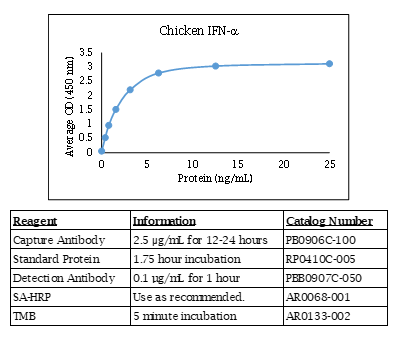 The Chicken IFN alpha polyclonal antibody is unlabeled and has been qualified for use in ELISA and Western blot applications. It is the capture antibody in the Kingfisher Biotech Chicken IFN alpha ELISA. The Chicken IFN alpha antibody was produced in goats and is antigen-affinity purified. The reactivity by species is: (Bovine IFN-alphaA - None) (Canine IFN-alpha - None) (Chicken IFN-alpha - Strong) (Equine IFN-alphaA - None) (Swine IFN-alpha1 - None). For research use only. Made in the USA