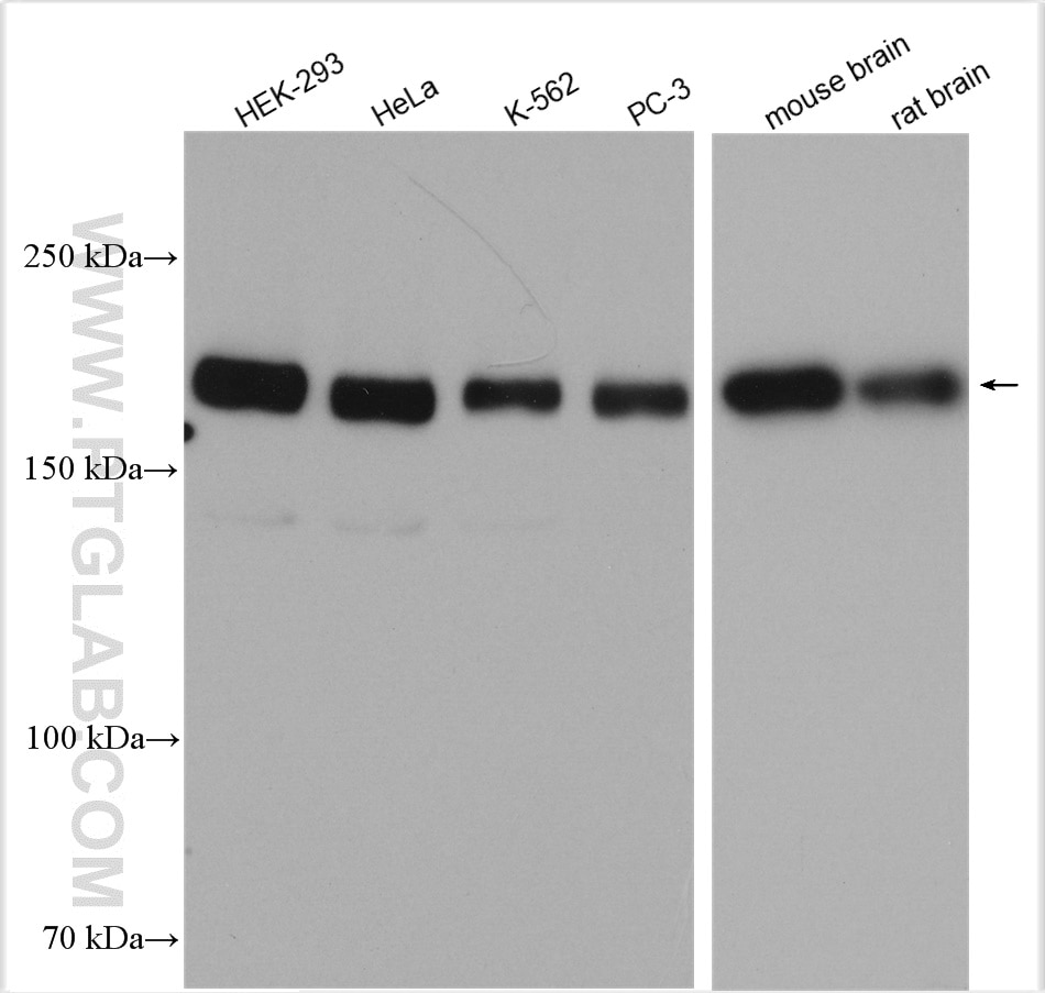 The Tuberin/TSC2 antibody from Proteintech is a rabbit polyclonal antibody to a recombinant protein of human Tuberin/TSC2. This antibody recognizes human, mouse, rat antigen. The Tuberin/TSC2 antibody has been validated for the following applications: WB, IHC, IF/ICC, FC (Intra), IP, ELISA analysis.