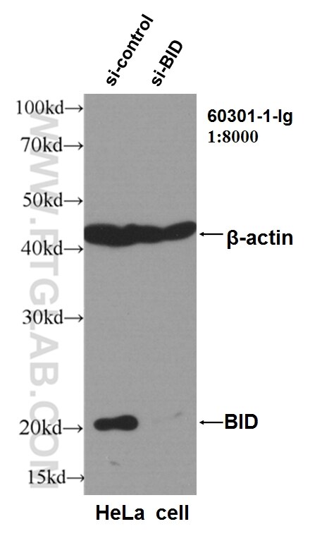 The BID antibody from Proteintech is a mouse monoclonal antibody to a recombinant protein of human BID. This antibody recognizes human antigen. The BID antibody has been validated for the following applications: WB, IHC, IF/ICC, ELISA analysis.