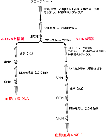 Norgen社Plasma/Serum RNA/DNA Purification Mini Kitの使用手順フローチャート。