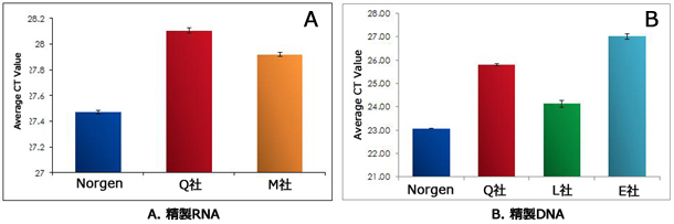 図3. 他社製品との比較。図3A.Norgen(NOG)社キットおよび各社RNA精製キットを用いて精製したRNAを鋳型にmiR-21についてRT-PCRを行った。NOG社キットは他社品と比較して高効率で分離・精製することがわかる。 図3B.NOG社キットおよび各社DNA精製キットを使用して精製したDNAを鋳型に5S rRNA 遺伝子について定量PCRを行った。NOG社キットは他社品と比較して高効率で分離・精製することがわかる。