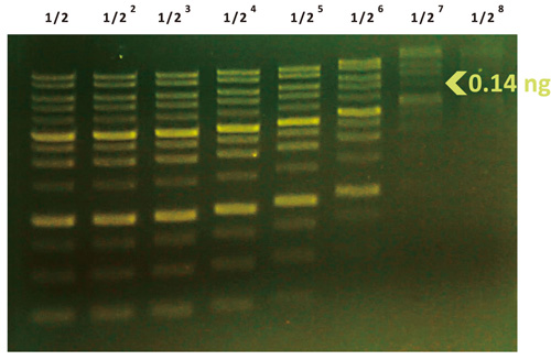 DNA マーカー(品番: DM3100)を2倍段階希釈。dsDNA 断片の検出は 0.14 ng まで可能。