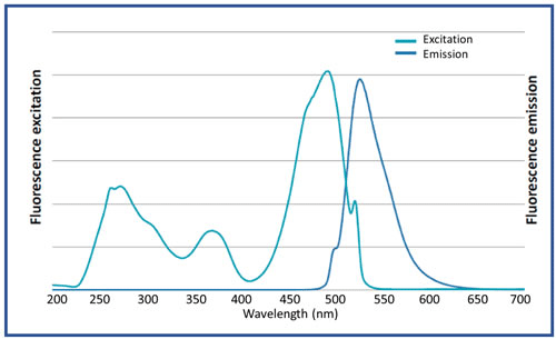 FluoroStain DNA蛍光染色色素(緑、10,000×)の二本鎖DNA結合時の蛍光ピークは522 nm、励起ピークは270nm、 370nmおよび497 nmを示す。
