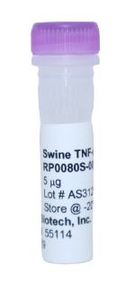 The Swine TNF alpha yeast-derived recombinant protein is not tagged and is naturally endotoxin-free. The purity is greater than 98% as visualized by SDS-PAGE analysis. Swine TNF alpha applications are for cell culture, ELISA standard, and Western Blot Control. The Swine TNF alpha yeast-derived recombinant protein can be purchased in multiple sizes. Swine TNF alpha Specifications: (Molecular Weight: 16.9 kDa) (Amino Acid Sequence: SSSQTSDKPVAHVVANVKAEGQLQWQSGYANALLANGVKLKDNQLVVPTDGLYLIYSQVLFRGQGCPSTNVFLTHTISRIAVSYQTKVNLLSAIKSPCQRETPEGAEAKPWYEPIYLGGVFQLEKDDRLSAEINLPDYLDFAESGQVYFGIIAL) (Gene ID: 397086). For research use only. Made in the USA
